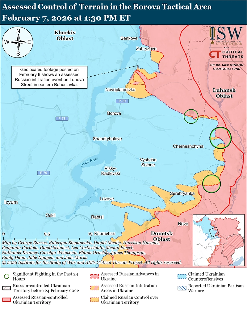 Оценка российского проникновения: геолокационные кадры, опубликованные 6 февраля, показывают российские войска в восточной части Богуславки (к северо-востоку от Боровой), что, по оценке ISW, вероятно, была миссией по проникновению и не изменила переднюю границу зоны боевых действий (FEBA). [33]
