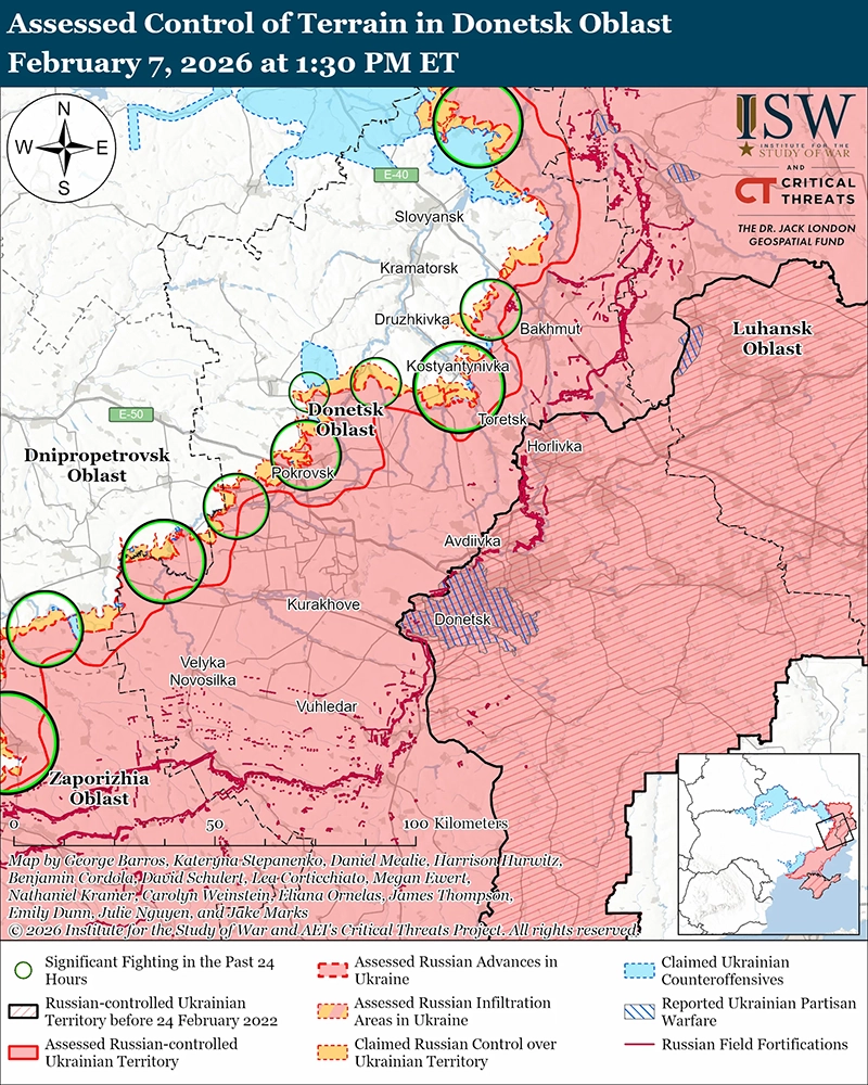 Президент Украины Владимир Зеленский сообщил журналистам 7 февраля, что Украина согласилась на предложенную США встречу в США, вероятно, в Майами, штат Флорида, в течение одной недели (примерно 12 февраля). [12] Пресс-секретарь Кремля Дмитрий Песков заявил, что «не было разговоров» о встрече в Соединённых Штатах и ответил «нет», когда его спросили, возможно ли участвовать в новом раунде мирных переговоров в США. [13] Российские официальные лица постоянно отвергали предложения о трёхсторонних переговорах и переговорах на уровне руководства с целью прекращения войны и постоянно ставили условия для оправдания дальнейших отказов непосредственно в период переговоров в Абу-Даби с 4 по 5 февраля. [14] Кремль по-прежнему не проявляет готовности идти на компромисс ради добросовестных мирных переговоров или признаков того, что примет что-то меньшее, чем полная победа России в Украине. [15]