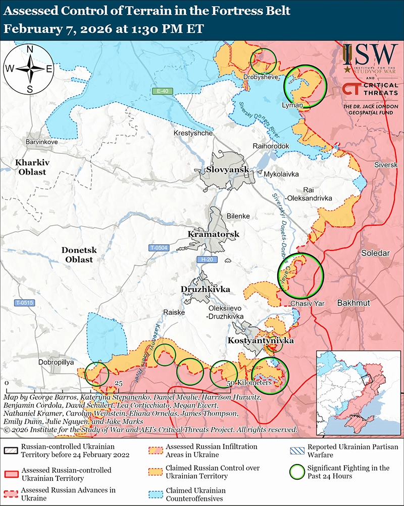 Генеральный штаб Украины сообщил 7 февраля, что украинские войска нанесли удары по пункту управления российскими беспилотниками возле Николаевки, по скоплению личных ресурсов возле Часового Яра (оба к северо-востоку от Константиновки) и по реактивной системе залпового огня (РСЗО) возле Полтавки (к югу от Дружковки) с 5 по 7 февраля. [40]