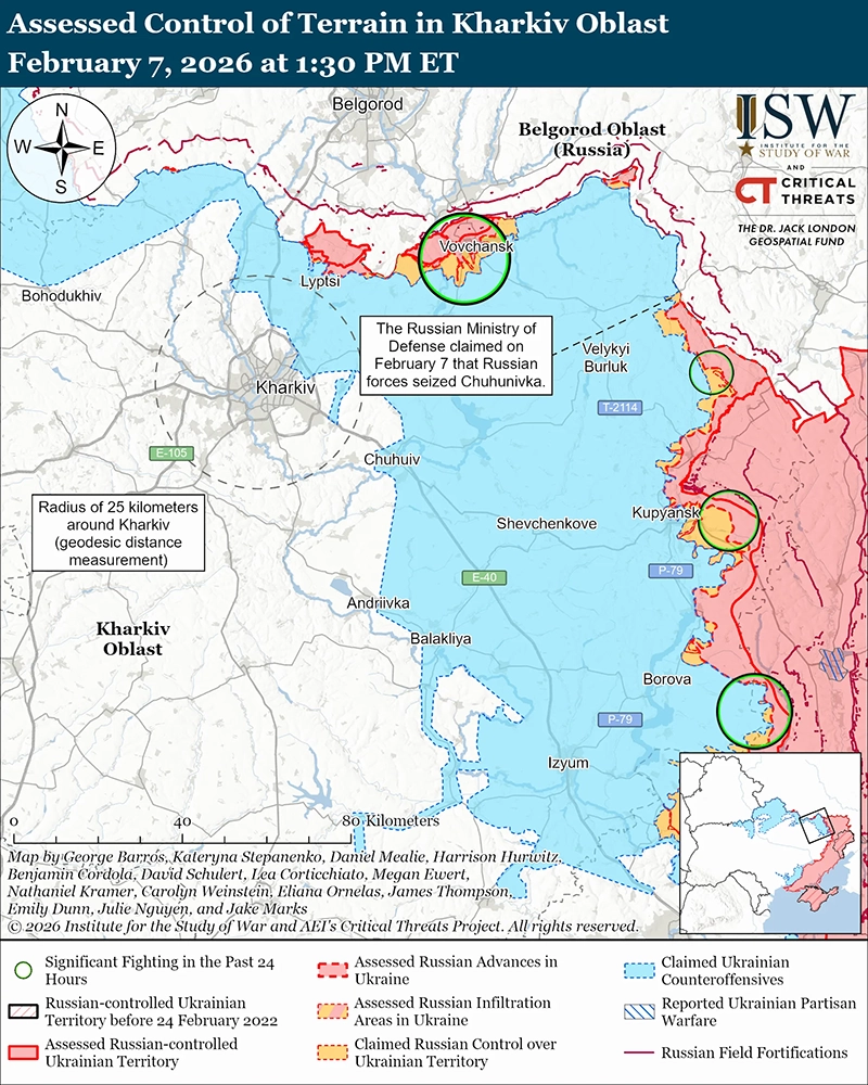 Российские войска продолжили ограниченные наступательные операции в направлении Купянска 7 февраля, но не продвинулись.