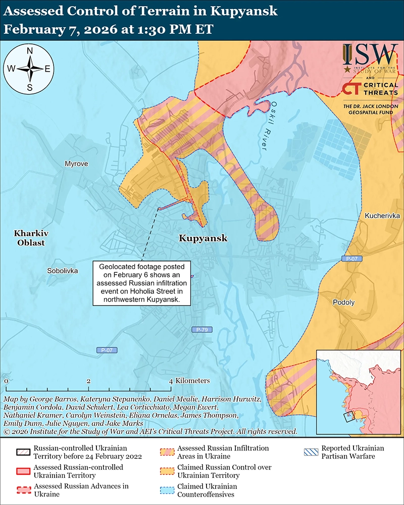 Оценка российского проникновения: геолокационные кадры, опубликованные 6 февраля, свидетельствуют о присутствии российских войск на северо-западе Купянска, что, по оценке ISW, вероятно, является миссией по проникновению и не изменила передний край зоны боевых действий (FEBA). [31]