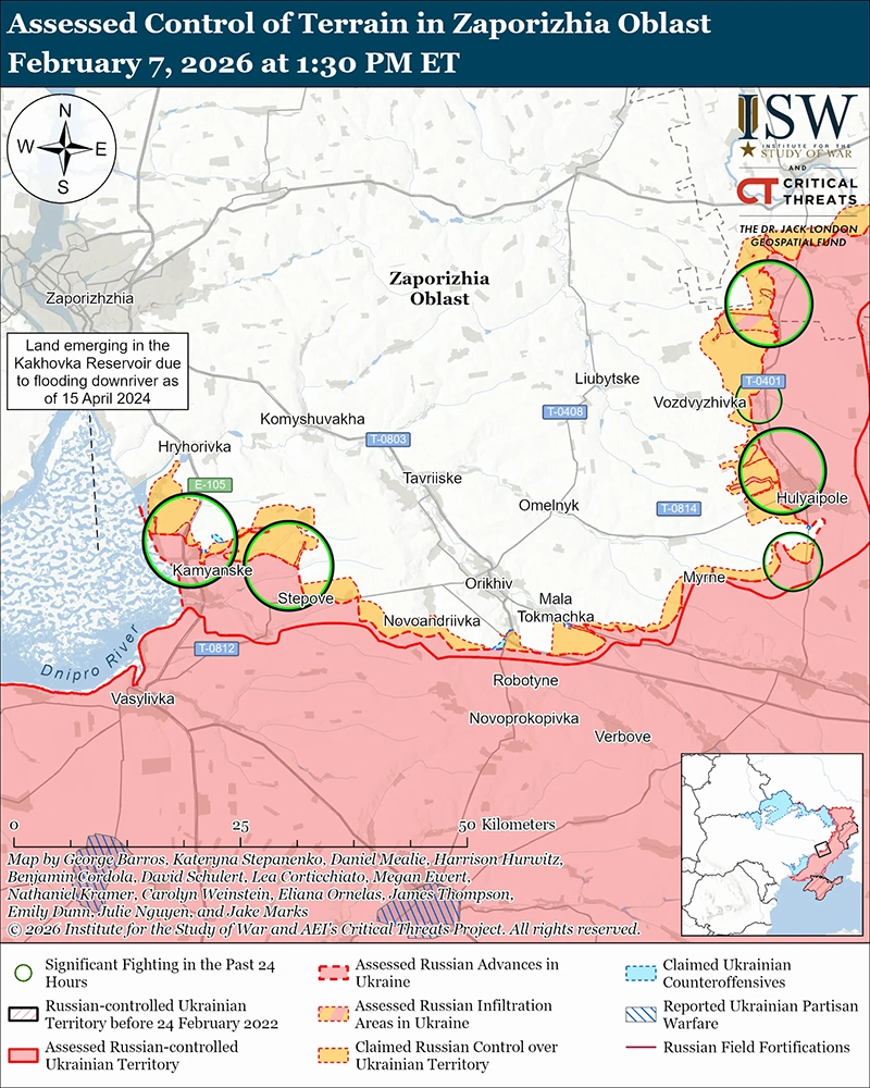 Украинские войска продолжили удар средней дальности по российским военным объектам в оккупированной Запорожской области 5 и 6 февраля. Генеральный штаб Украины сообщил 7 февраля, что украинские силы нанесли удар по российскому учебному и производственному центру беспилотников с видом от первого лица (FPV) возле оккупированного Камыш-Зоря (примерно в 45 километрах за линией фронта) и логистический склад возле оккупированного Ровно (примерно в 65 километрах за линией фронта). [62]