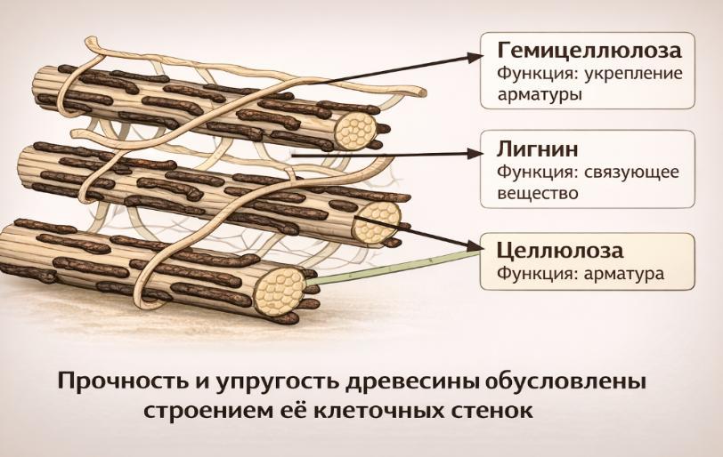 Исходили из того, что древесина – это натуральный полимерный композит. Про это тогда не знали с позиции теории, но находили всё экспериментально, просто фиксируя свойства. Целлюлозные волокна древесины скреплены матрицей лигнина и гемицеллюлозы.