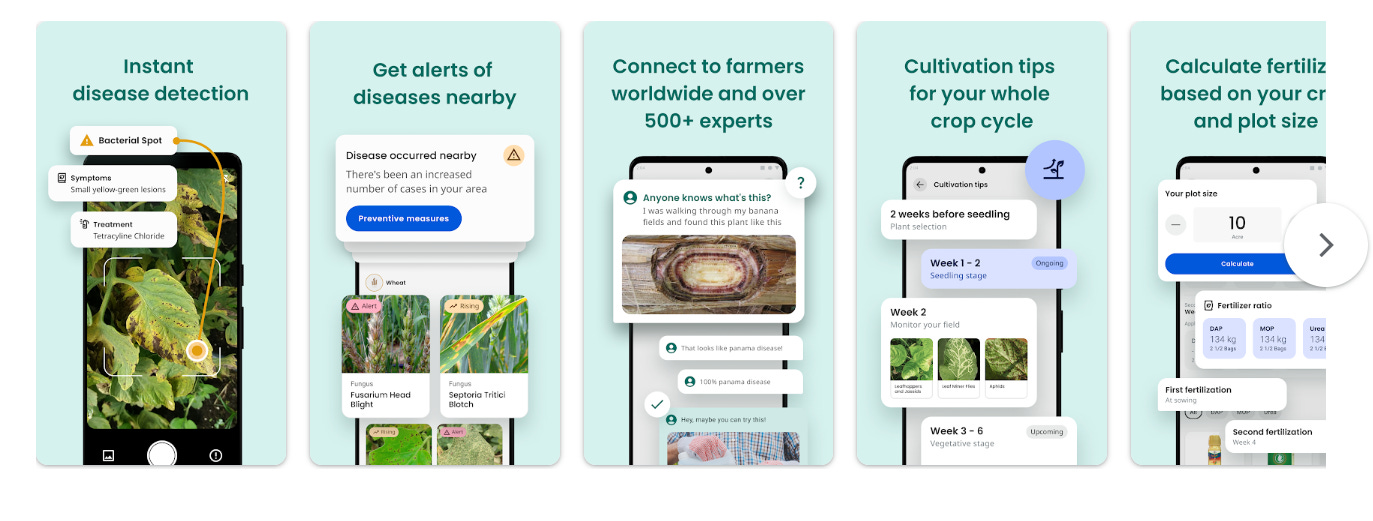 Берлінська компанія PEAT GmbH. ШІ-діагностика за фотографіями охоплює 780+ типів ушкоджень рослин у понад 30 культурах. 19 мов інтерфейсу; 10+ мільйонів завантажень. Хоча орієнтований на агрокультури, є корисним в агролісових системах і для діагностики хвороб листяних порід.