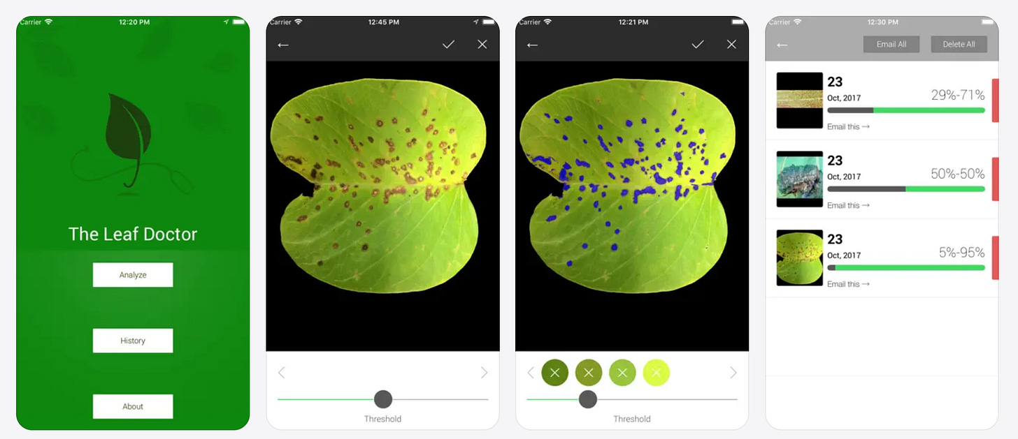 Розроблено Університетом Гаваїв у співпраці з Корнелльським університетом. Кількісно оцінює ступінь ураження листя хворобами або шкідниками у відсотках від загальної площі листової пластинки. Точність R² ≥ 0,79. Служить безкоштовною альтернативою спеціалізованому програмному забезпеченню Assess, що коштує понад $800. Незамінний для польових досліджень із лісової патології.