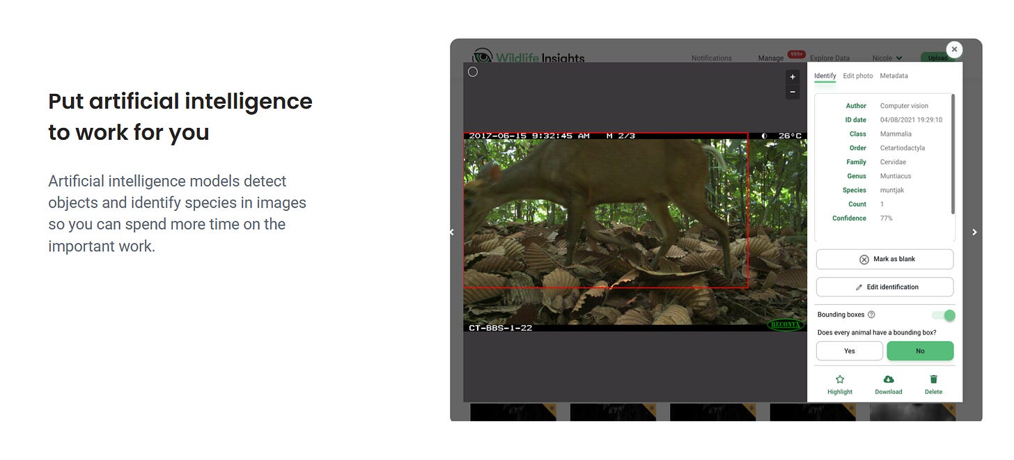 Консорціум Conservation International, Google, WCS, WWF, ZSL. ШІ-обробка зображень фотопасток на основі Google ML автоматично класифікує виявлені види. Безкоштовно для організацій, що використовують менше 50 камер. Зростаючий інструмент у Центральній і Східній Європі.