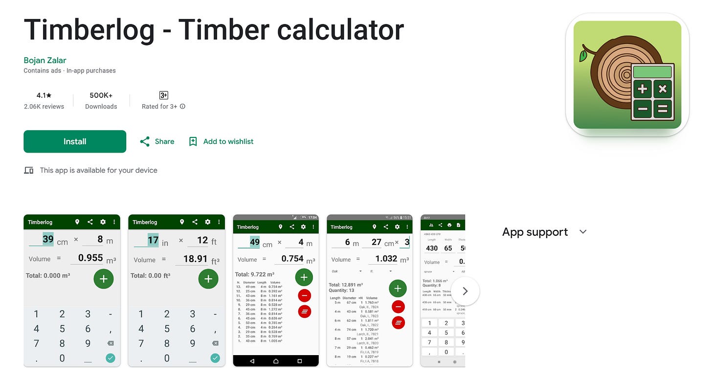 Словенська розробка Бояна Залара. Найбільш комплексний безкоштовний калькулятор об’єму деревини у світі. Підтримує понад 15 методів: ISO 4480-83, ЧСН/СТН (Чехія/Словаччина), метод Губера, Малєні, Дойля, Скрібнера, Гоппуса, французький NF, японський JAS, естонський метод А. Нільсона. Враховує товщину кори, дозволяє встановлювати ціну за кубометр, експортує в Excel, підтримує Bluetooth-принтер. Понад 650 000 завантажень.