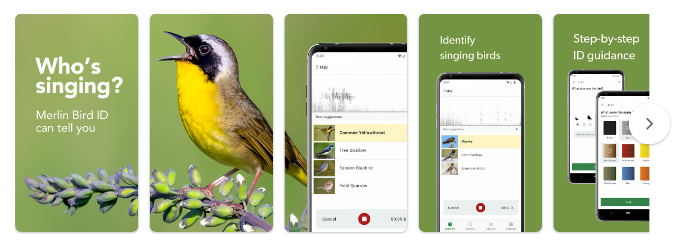 Також від Лабораторії Корнелла. Революційна функція Sound ID ідентифікує вид птаха за голосом у режимі реального часу просто через мікрофон смартфона. Доступні пакети для Європи, що завантажуються для офлайн-роботи. Наочно демонструє потенціал ШІ-акустики в моніторингу біорізноманіття.