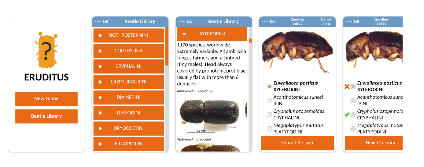 Розроблено Університетом Флориди у партнерстві з USDA. Навчальна бібліотека та тест-система для визначення короїдів зі сотнями якісних фотографій. Гейміфікований формат мотивує систематичне опанування морфологічних ознак. Ключовий навчальний інструмент для роботи з Ips typographus – основним шкідником ялини в Україні та Центральній Європі. Безкоштовний.