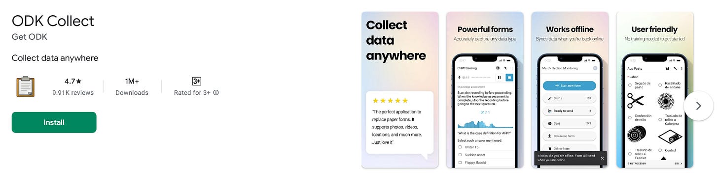 Безкоштовна платформа від Університету Оксфорда. Форми конструюються через вебінтерфейс і підтримують GPS, фото, відео, аудіо, текстові та числові поля, умовні переходи. Усі зібрані дані доступні в особистому кабінеті у вигляді таблиць, карт і діаграм. Понад 500 000 завантажень. Використовується в програмах ФАО та численних обстеженнях у тропічних лісах.