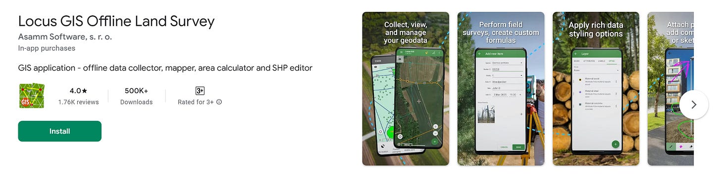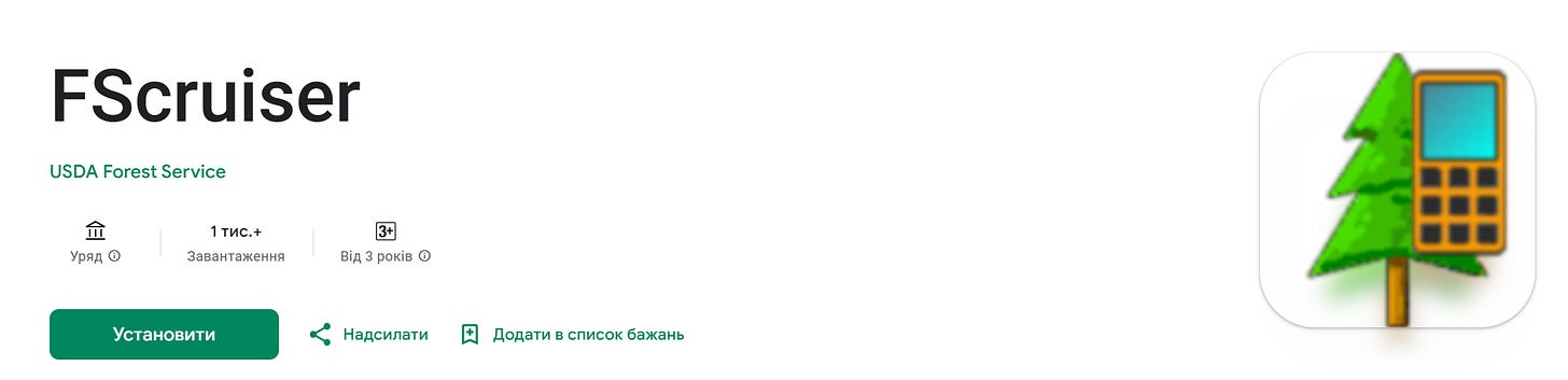 Офіційний застосунок Лісової служби USDA для GPS-картування й польового збору даних. Дозволяє записувати GPS-треки, виконувати прив’язані до точок обстеження деревостану, формувати звіти. Рейтинг 4.0 в Google Play. Безкоштовний, підтримується держустановою.