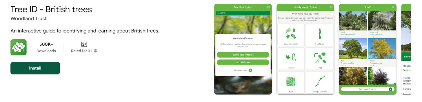 Мобільний визначник дерев від британської організації Woodland Trust. Охоплює усі корінні та поширені інтродуковані дерева Британських островів із визначенням за сезонними ознаками: кора, бруньки, листя, квіти, плоди, форма. Значна частина видів перетинається з деревостаном листяних лісів Центральної та Східної Європи. Повністю офлайн, безкоштовний.