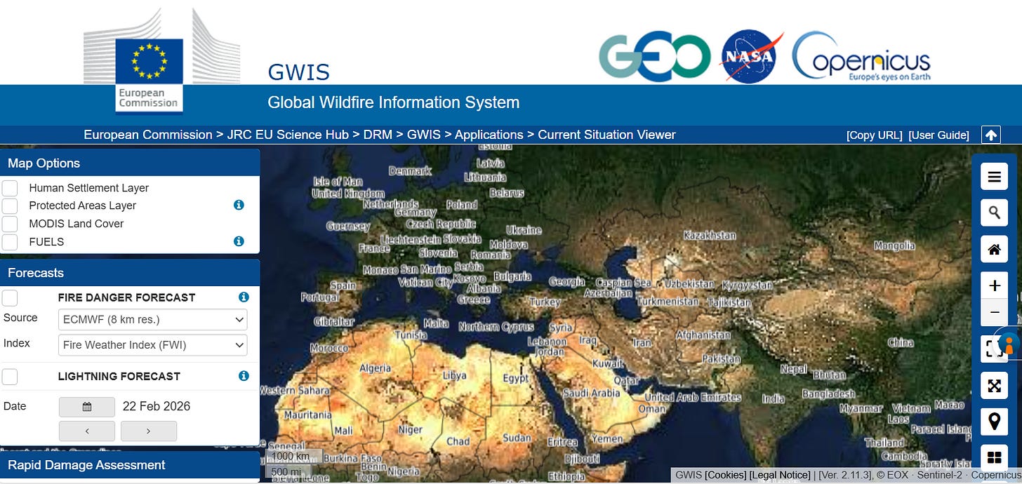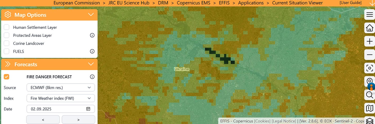 Copernicus Drought Observatory та Global Drought Observatory від JRC ЄС. Моніторинг посухи: аномалії опадів, вологість ґрунту, індекси рослинності, комбінований індикатор посухи, SPI та SPEI. Охоплює Україну. Необхідний для оцінки передпожежного стресу деревостану і ризику всихання.