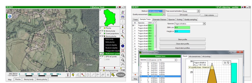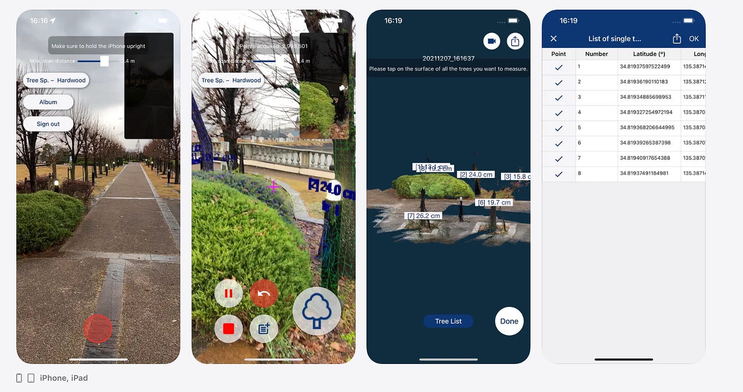 Розроблено дослідниками Інституту лісових ресурсів Хоккайдо та компанією Mapry (Японія). Використовує LiDAR-датчик для вимірювання діаметра стовбурів і побудови просторової карти пробної площі в реальному часі. Коефіцієнт детермінації R² = 0,963 порівняно з вимірами мірною вилкою; за 1 годину 39 хвилин можна виміряти понад 672 стовбури/га. Результати підтверджені в публікації Methods in Ecology and Evolution (Wiley, 2022). Безкоштовний.