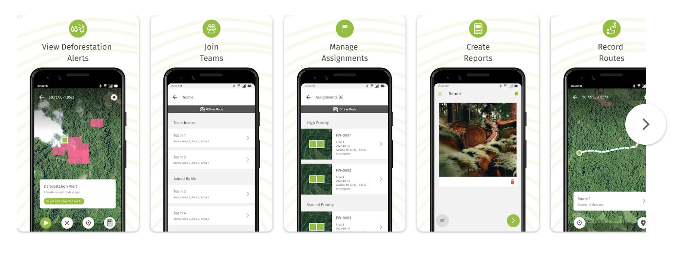 Розроблено World Resources Institute. Завантажує інформацію щодо можливого знеліснення чи лісозаготівель (GLAD, RADD) та знімки Planet 5 м на пристрій для офлайн-верифікації в полі. GPS-геоприв’язані звіти з фотографіями. Доведений вплив: сповіщення Forest Watcher призвели до арештів за незаконні лісозаготівлі в Індонезії та Бразилії; система використовується Інститутом Джейн Гудолл (Уганда) і держагентствами Ліберії.