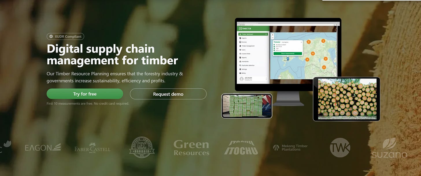Естонська компанія Timbeter OÜ. ШІ-аналіз фотографії торців штабелю колод забезпечує точність вимірювання ±1,5%. Геотеги, хмарне сховище, корпоративні звіти. Безкоштовний рівень: 10 вимірювань; комерційна підписка від €125/місяць. Один із небагатьох продуктів із Балтійського регіону, що активно розширюються на ринки Центральної та Східної Європи.