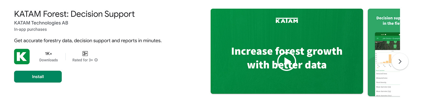 Шведська технологічна компанія Katam Technologies. Застосунок знімає відео деревостану на пробній площі, а хмарний ШІ обробляє матеріал і видає оцінки запасу, суми площ перерізів, розподілу діаметрів і щільності стовбурів. Система вже апробована у понад 80 країнах, добре працює з ялиною та сосною. Доступний безкоштовний пробний доступ.