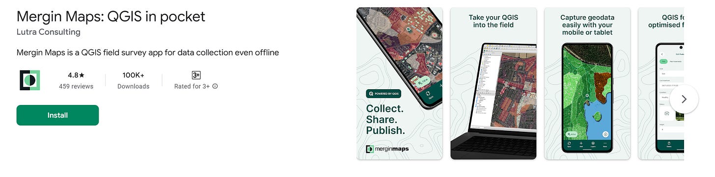 Розроблений британською компанією Lutra Consulting. Прямий компаньйон QGIS: зміни, внесені в полі через Mergin Maps, автоматично синхронізуються з настільним QGIS-проєктом через хмарний сервіс. Підтримує зовнішні GNSS-приймачі. Відкритий код. Має конкретний задокументований кейс використання у картуванні торфовищ.