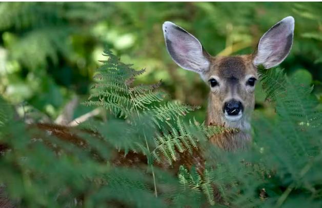 Олень выглядывает из-за листьев в лесу. THE CANADIAN PRESS/Джонатан Хейворд