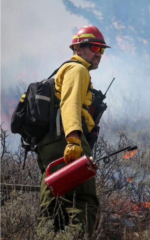 Пожарный использует капельный факел во время контролируемого выжигания в Национальном лесу Бриджер-Тетон.