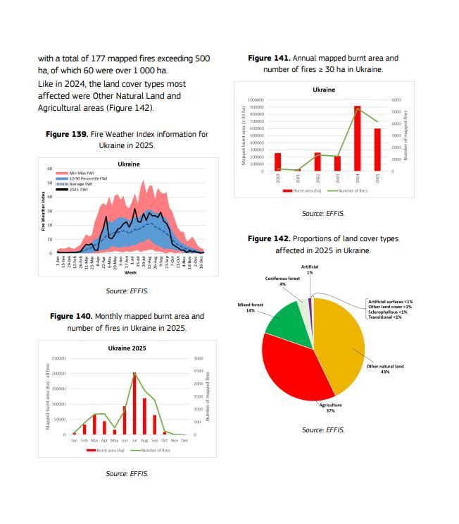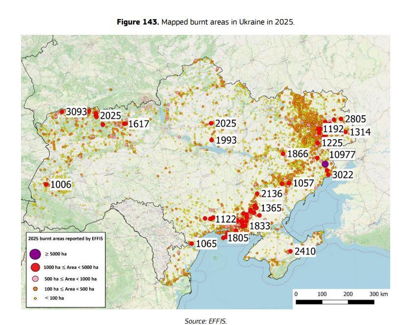 Украина сообщает лишь о немного меньшей цифре — 659 853 гектара. В основном это прифронтовые территории. Гослесагентсво в своей отчетности за 2025 год указало 5.6 тыс га пожаров из которых только 122 га верховых.