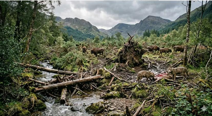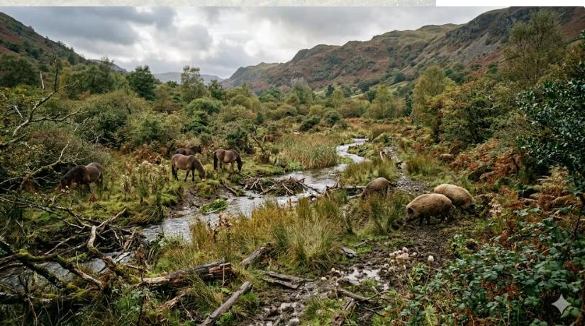 Искусственный интеллект действительно способен создавать изображения экологически точных процессов восстановления дикой природы. Например, это изображение, созданное с помощью Gemini, запечатлело беспорядок и хаос подлинно восстановленного британского ландшафта: