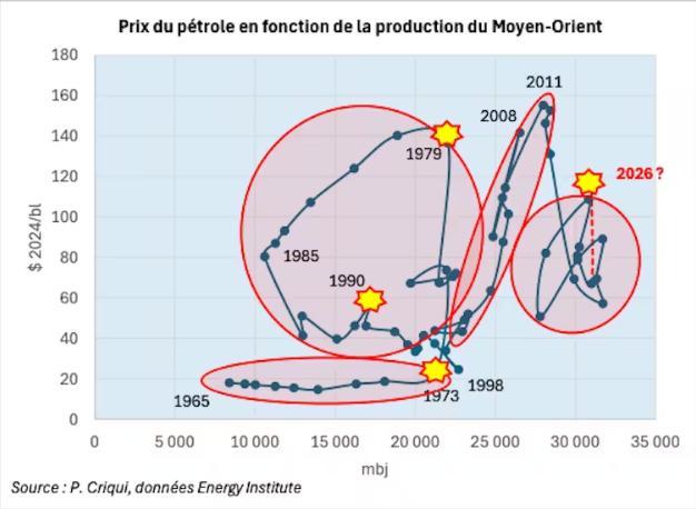 Цены на нефть в зависимости от уровня добычи нефти на Ближнем Востоке. П. Крики/Данные: Энергетический институт , предоставлено автором.