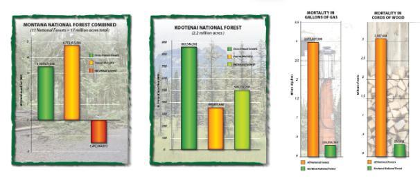 В последнем отчетном году погибло в общей сложности 4,8 миллиарда кубических футов древесины. Чистый прирост — валовой прирост за вычетом гибели — составил минус 1,4 миллиарда кубических футов. Этого количества древесины хватило бы на строительство около 117 000 домов с тремя спальнями. Этого хватило бы, чтобы в этом году обеспечить работой более 1 500 человек в лесозаготовительной или лесоперерабатывающей отраслях в Айдахо или Монтане.