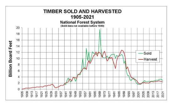 На приведенном ниже графике показаны объемы заготовки с 1905 года, когда была основана Лесная служба, по 2021 год. Объем заготовки в 2021 году был примерно таким же, как и в 1944 году, а пик пришелся на период «войны за пятнистую сову» в 1988 году.