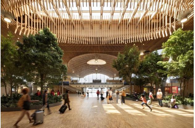 Недавно завершенный зал международного аэропорта Портленда отличается красивой надстройкой, выполненной из массивных фанерных панелей, изготовленных компанией Freres Engineering из города Лайонс, штат Орегон. Часть древесины была спасена с лесных угодий Freres, пострадавших от пожара Beachie Creek в 2020 году. Пожар, вызванный ударом молнии, начался на прилегающих землях Национального леса Уилламетт, а затем распространился на запад, охватив территории Freres. Компании потребовался год, чтобы восстановить то, что было утрачено. Неспасенная древесина, погибшая в результате пожара, становится пристанищем для насекомых и часто снова загорается. Фото Freres