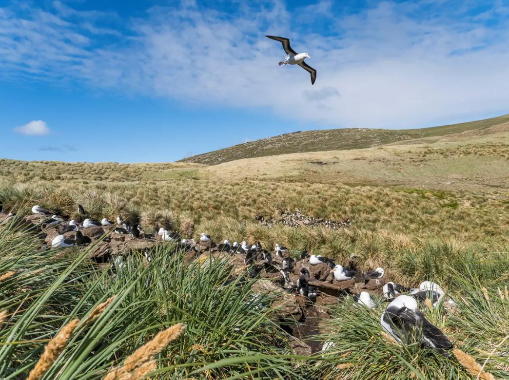 Чернобровый альбатрос пролетает над местом гнездования на Фолклендских островах. Альбатросам требуются годы, чтобы научиться ориентироваться на больших расстояниях в поисках пищи. Мартин Цвик / REDA / Universal Images Group через Getty Images