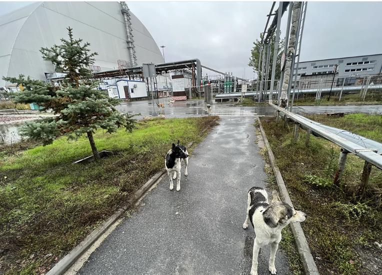 Бездомные собаки — потомки домашних животных, брошенных в окрестностях Чернобыля, — теперь бродят вблизи защитного экрана, за которым находится разрушенный реактор (Фото: Тимоти Муссо/CFF)