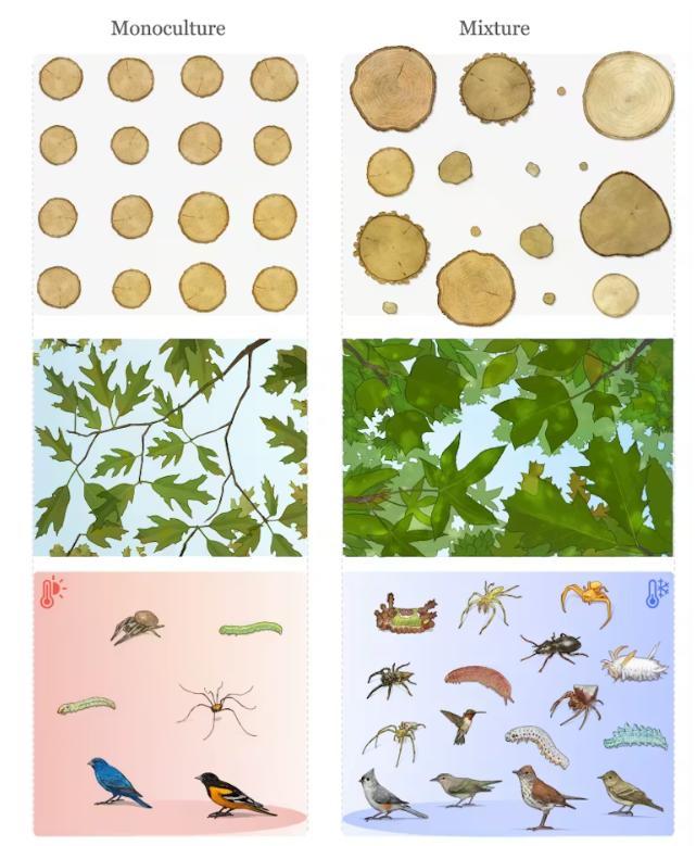 Участки с несколькими видами деревьев также имели гораздо более полные и густые кроны, что создавало более прохладные и тенистые условия, способствующие процветанию растений нижнего яруса и поддерживающие на 50 % больше насекомых, пауков и птиц.