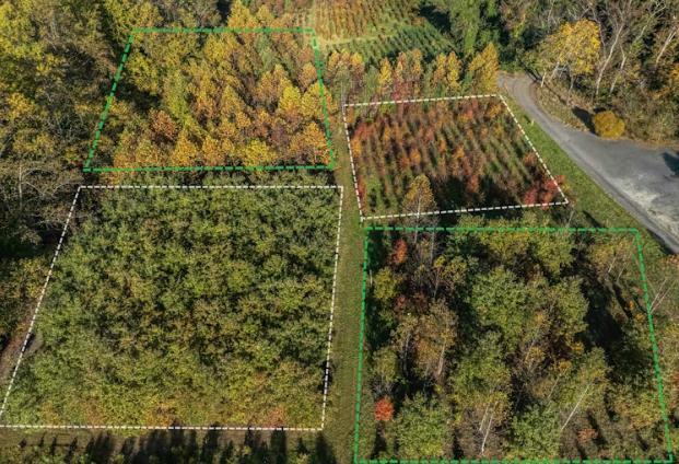 На снимке, сделанном с помощью дрона, видны некоторые участки проекта BiodiversiTREE, в том числе монокультуры, обозначенные белым цветом, и смешанные насаждения, обозначенные зеленым. Микки Пуллен/Смитсоновский центр экологических исследований