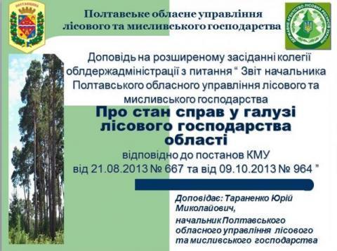 13 грудня начальник Полтавського обласного управління лісового та мисливського господарства Юрій Тараненко під час розширеного засідання Полтавської ОДА зробив звіт про стан справ у галузі лісового господарства області відповідно до постанов Кабінету Міністрів України від 21.08.2013 № 667 та від 09.10.2013 № 964.