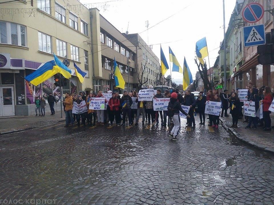 Молодые люди с плакатами "Кому принадлежат украинские леса?" и "Какие законные причины уничтожения леса" перекрыли пешеходный переход на улице Ярослава Мудрого в Мукачево.