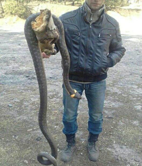 Чоловіки зняли вужа з дерева палицею. Вони повідомили, що язик змії довжиною не менше 20 см, зуби – по 2 см. Такого розміру вужі – велика рідкість, вони не часто виростають більше 1 метра.