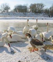 У Володимирі-Волинському, над Білими берегами, зимують лебеді (на фото). Січневого дня їм привезли «обід» журналісти міськрайонної газети «Слово правди»