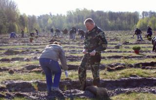 Отож, прослухавши інструктаж, працівники апарату облдержадміністрації, озброєні мечами Колосова та посадковим матеріалом, дружно взялися до роботи. А вона виявилася нелегкою, бо на території, де відтепер красуватиметься лісок, не так давно було місцеве пасовище, а ще раніше – склад щебеню. Незважаючи на те, що лісівники попередньо розпушили землю, знаходилися місця, де зробити лунку було непросто. Проте справа просувалася досить швидко і вже через деякий час понад 18 тис. саджанців сосни звичайної та близько 5 тис. вільхи чорної було висаджено у ґрунт.