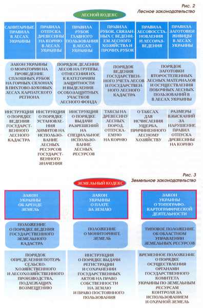 1. Лесное право в настоящее время включает 5 блоков законов (рис.1). Собственно лесное законодательство во многом зависит от большого количества правовых документов, входящих в гражданско-административный, земельный, природоресурс-ный и природоохранный блоки. Все они имеют сложную структуру, причем в лесном, земельном, (рис. 2, 3) и природоресурсном блоках ясно выражены основные законы – Земельный и Лесной Кодексы и Закон об охране окружающей среды, доминирующие над остальными законодательными актами. В природоохранном и гражданско-админи-стративном законодательствах основные законы выделить трудно, т.к. многие из них имеют одинаково высокую значимость, например, Законы о собственности, предприятии, налогообложении, гражданский, криминальный и административный Кодексы. Анализ динамики законотворчества и содержания принятых в разное время законов позволяет сделать следующие выводы: во-первых, в пределах каждого блока большинство основополагающих законов принято раньше второстепенных; во-вторых, чем раньше принят закон, тем в большей степени он наследует положения права, сложившегося в другой стране и в другой экономической системе. Современное лесное законодательство Украины сформировано в период с 1994 по 1999 год и с тех пор менялось только в деталях: пересматривались таксы, уточнялись инструкции. В основном оно подготовлено специалистами системы Госкомлесхоза и по своей структуре и содержанию в значительной степени повторяет лесное законодательство советского времени.