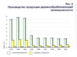 Своего пика кризис достиг в 1996-1997 годах (рис. 5). Динамика производства бумаги на душу населения с 1990 по 1997 год упала с 17,5 до 5,3 кг, картонной тары – с 365 до 120 м2. (Для сравнения напомним, что европейские страны потребляют на душу населения в среднем бумаги 150 кг/год, Швеция – 250 кг, а Северная Америка – более 320 кг.) Производство струганого шпона упало с 60 млн м2 в 1991 году до 582 тыс м2 – в 1996 году. Аналогична ситуация с выпуском мебели, столярных изделий, паркета, фанеры. В 1998-1999 годах падение производства остановилось. В эти годы, преимущественно за счет иностранных инвестиций и доходов от экспорта, начинают крепнуть и технически перевооружаться многие предприятия лесной промышленности, появляется и начинает работать ряд современных производств, полностью принадлежащих иностранным инвесторам. На этой базе в 2000 году наметился, а в 2001 начался, подъем лесной промышленности страны.