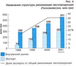 Объем экспорта лесопродукции государственными лесными предприятиями в ценовом выражении постоянно растет, однако его доля в общем объеме поставок товаров этой группы остается постоянной – около 20%. В этом году, по нашему прогнозу, она несколько увеличится (до 21-23%), что связано с ограничением в ряде западных областей экспорта круглого леса, которое коснулось прежде всего частных предприятий и физических лиц. В целом, за годы независимости Украина превратилась из крупного импортера лесопродукции в его экспортера. В 2000 году совокупный объем экспорта в пересчете на круглый лес оказался соизмерим с объемом главного пользования (в круглом и переработанном виде экспортировано пиловочника, для получения которого необходимо срубить более 4 млн м3 спелого леса). Создавшуюся ситуацию нельзя считать нормальной. Она вызвана тем, что с падением лесопромышленного производства в Украине, которое являлось основным потребителем древесного сырья, находящего сбыт на западном рынке, лесной экспортный потенциал страны искусственно возрос. Значительные различия в ценах, льгота по НДС и отсутствие вывозных пошлин сделали экспорт лесопродукции особо привлекательным. Кроме того, при экспорте на расчетный счет приходят “живые деньги”. Напомним, что долгое время внутренние поставки осуществлялись, в основном, путем бартерных сделок, а бартер – это сплошные долги и убытки.