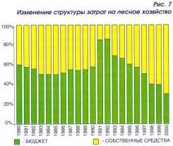 Если в относительно стабильные 80-е годы лесное хозяйство 55-60% общего финансирования получало из бюджета, то в 2000 году доля бюджетных ассигнований упала до 25%. Значительная часть бюджетных средств направляется на цели лесоразведения, ле-совосстановления, охрану и защиту леса, а также заработную плату работников лесной охраны, причем в основном степных и Карпатских областей, а также Крыма. Растет число предприятий, полностью отказавшихся от бюджетного финансирования и ставших самоокупаемыми, даже при современной, крайне неблагоприятной для всех легальных производств, системе налогообложения.