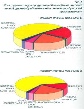5. Рынок лесопродукции, особенно внешний, и его динамика является зеркалом, хорошо отражающим состояние лесного сектора в целом и его отдельных составляющих. Объем экспорта лесной, деревообрабатывающей и целлюлозно-бумажной продукции в последние годы растет опережающими темпами (рис. 8). В этой связи увеличивается и доля лесного комплекса в общем экспорте страны: в 1998 году она составляла 1,6%, а в 2000 – уже 3,8%. Почти в три раза за эти годы выросла доля экспорта бумаги и картона, производимых из макулатуры и привозной целлюлозы (в основном это техническая), специальной (электроизоляционная, жиро- и влагостойкая) бумаги, а также гофрокартона и гофротра.