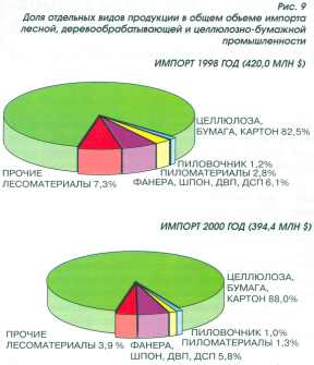 Более чем в два раза выросла доля экспорта продукции лесопереработки, тогда как процент, приходящийся на экспорт круглого леса, к 2000 году увеличился не значительно, а в 2001 начал уменьшаться. При росте импорта лесопродукции в абсолютном выражении, его доля в совокупном импорте Украины осталась практически неизменной (рис. 9).