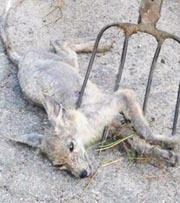 І ось кілька днів тому дві дівчини побачили, як невідомий звір на двох лапах стрибав прямо по сільській дорозі! Одна з юнок покликала батька. Той взяв вила, вислідив дивну істоту і заколов її.
