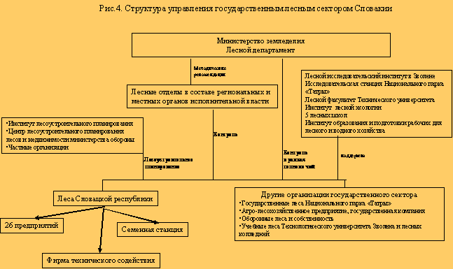 Структура управления. Институциональная структура государственного лесного сектора Словакии за постсоветский период претерпела целый ряд изменений, но все еще не может считаться удовлетворительной. Существующая система лесного администрирования внедрена в 1996 году. Центральный ее орган с 1993 года находится в подчинении Министерства земледелия, занимающегося всем вопросами, касающимися земли и ее использования (рис.4).