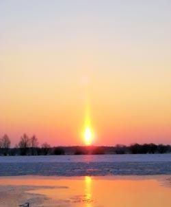 Розглядаю фотографії й ще раз переконуюся, що сонячний стовп разом із сонячним диском був дуже схожий на величезну свічу на вранішньому небі. Вона віддзеркалювалася в незамерзлій річковій воді Стоходу. Річка ж парувала. Я фотографував це дивне явище 41 хвилину (це зафіксував мій електронний фотоапарат). А перша фотографія була зроблена о 7 годині 46 хвилин.
