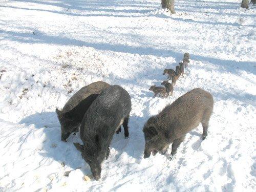 Дорогою юні природолюби дізналися, що найважче звірам доводиться взимку, коли лютують морози і глибоким снігом вкриті всі пасовища. Працівники мисливського господарства допомагають їм кормами, охороняють від браконьєрів, створили двадцять три підгодівельних майданчики – це щось на зразок лісових ресторанчиків, кафе, їдалень для звірят. Щодня звірині підвозять сінце, кукурудзу, зернові. Так що найбільш довірливі звірі, зачувши гуркіт тракторця чи скрип саней, поспішають назустріч: «А що смачненького ви нам привезли?» Так трапилось і цього разу. Першою скрип саней зачула Маша і разом із поросятками та двома дорослими вепрами-охоронцями прибігла до найближчого лісового ресторанчика. Діти дістали торбинки і взялися пригощати звірину, а заодно і знайомитись із маленьким потомством. Спробували навіть кожному ім’я дати, та як їх розрізнити, коли всі схожі один на одного.