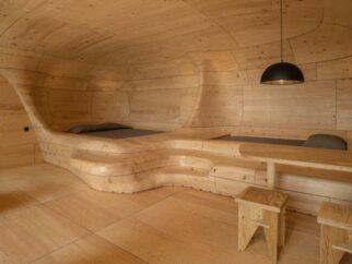 Деревянный отель в форме пещеры изготовлен из тысячи деталей из ели ручной обработки